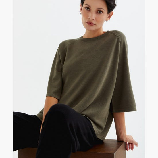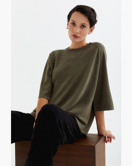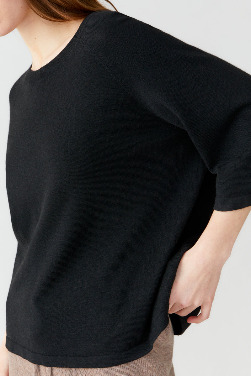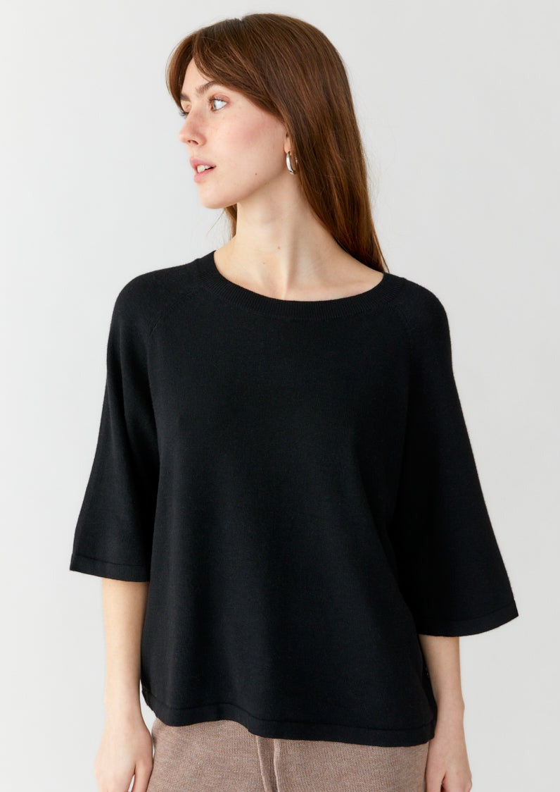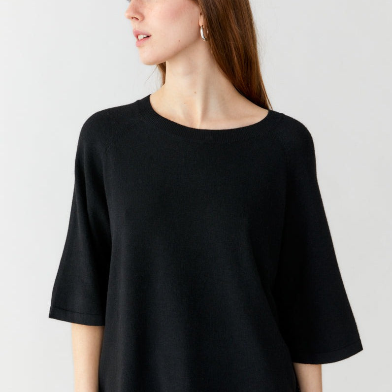 A thin-knitted t-shirt with a boxy fit with elegant raglan sleeves made in a super soft and light bamboo and cashmere blend. The t-shirt is perfect to wear both as a cozy garment at home or at work. The material is breathable, super soft, antibacterial. The bamboo material will guarantee a super soft clothing experience that is also kind to sensitive skin.