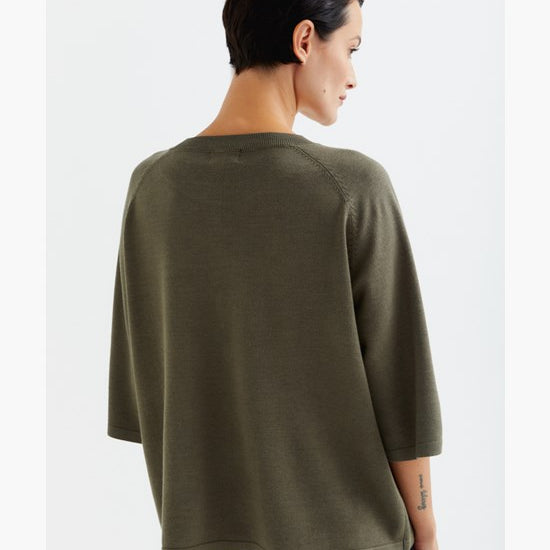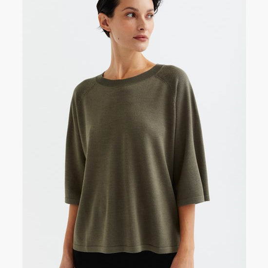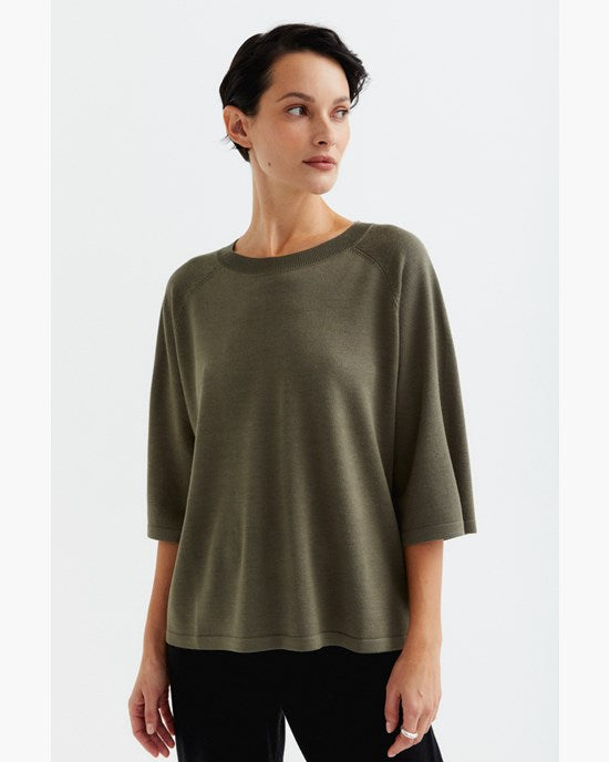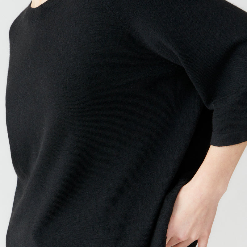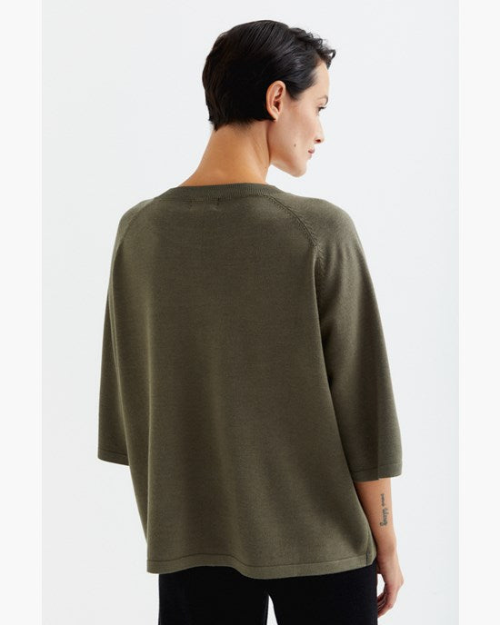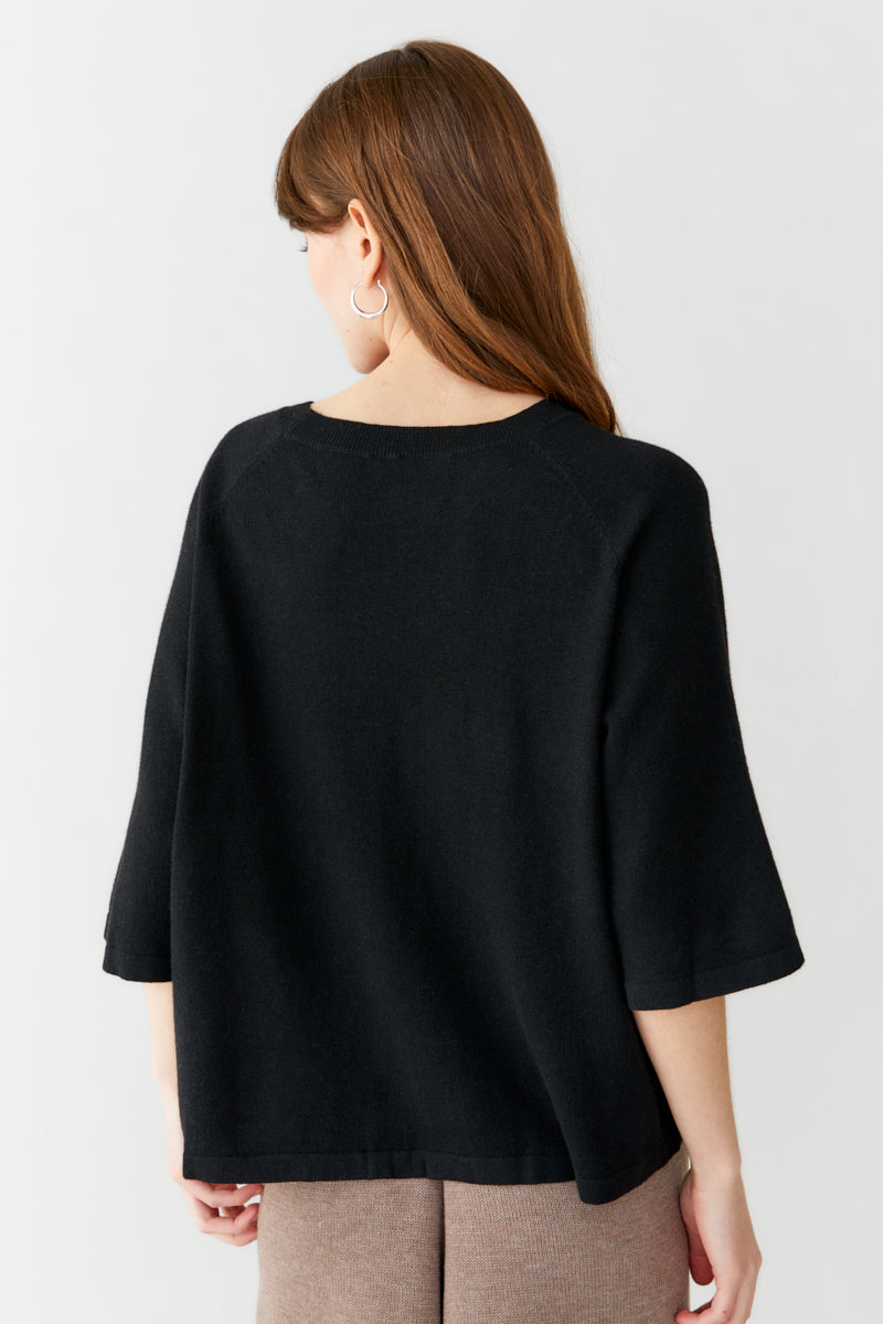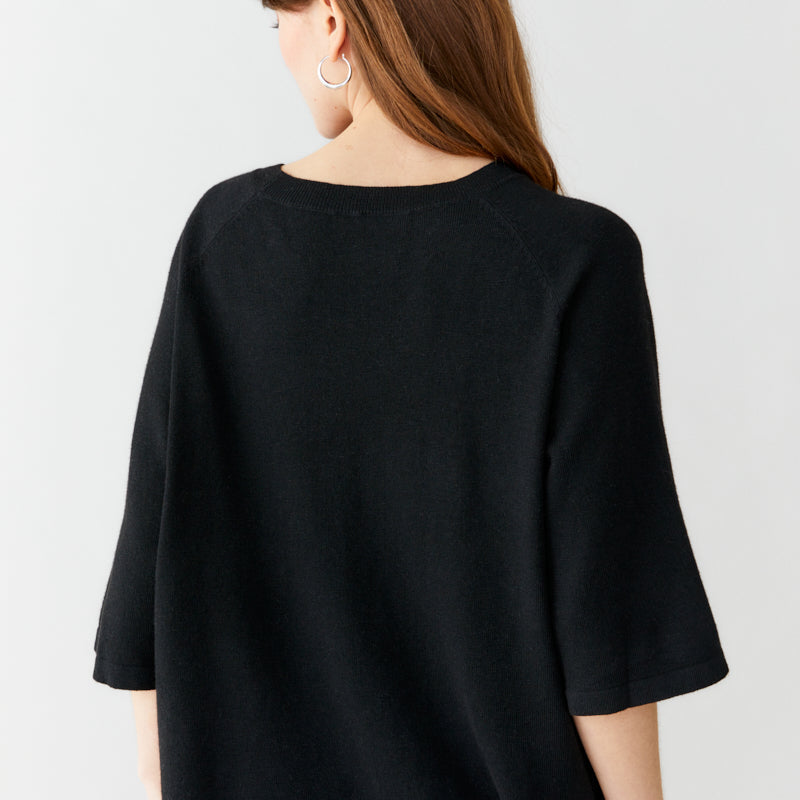 A thin-knitted t-shirt with a boxy fit with elegant raglan sleeves made in a super soft and light bamboo and cashmere blend. The t-shirt is perfect to wear both as a cozy garment at home or at work. The material is breathable, super soft, antibacterial. The bamboo material will guarantee a super soft clothing experience that is also kind to sensitive skin.