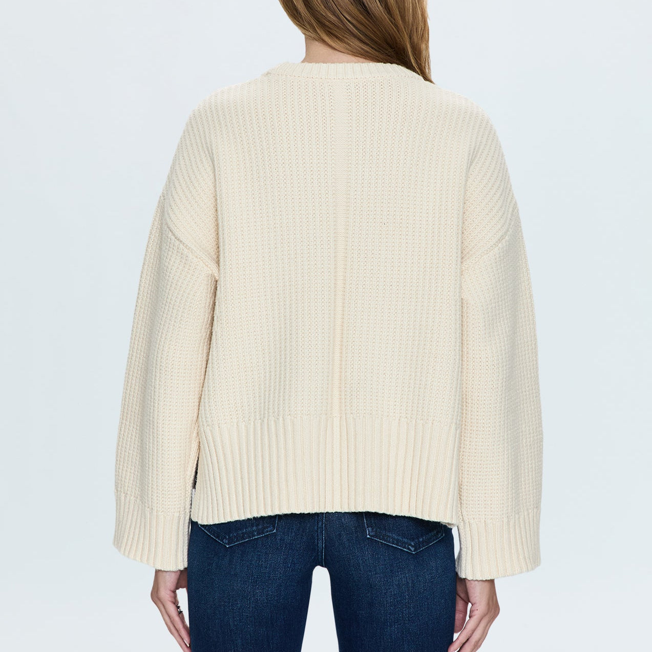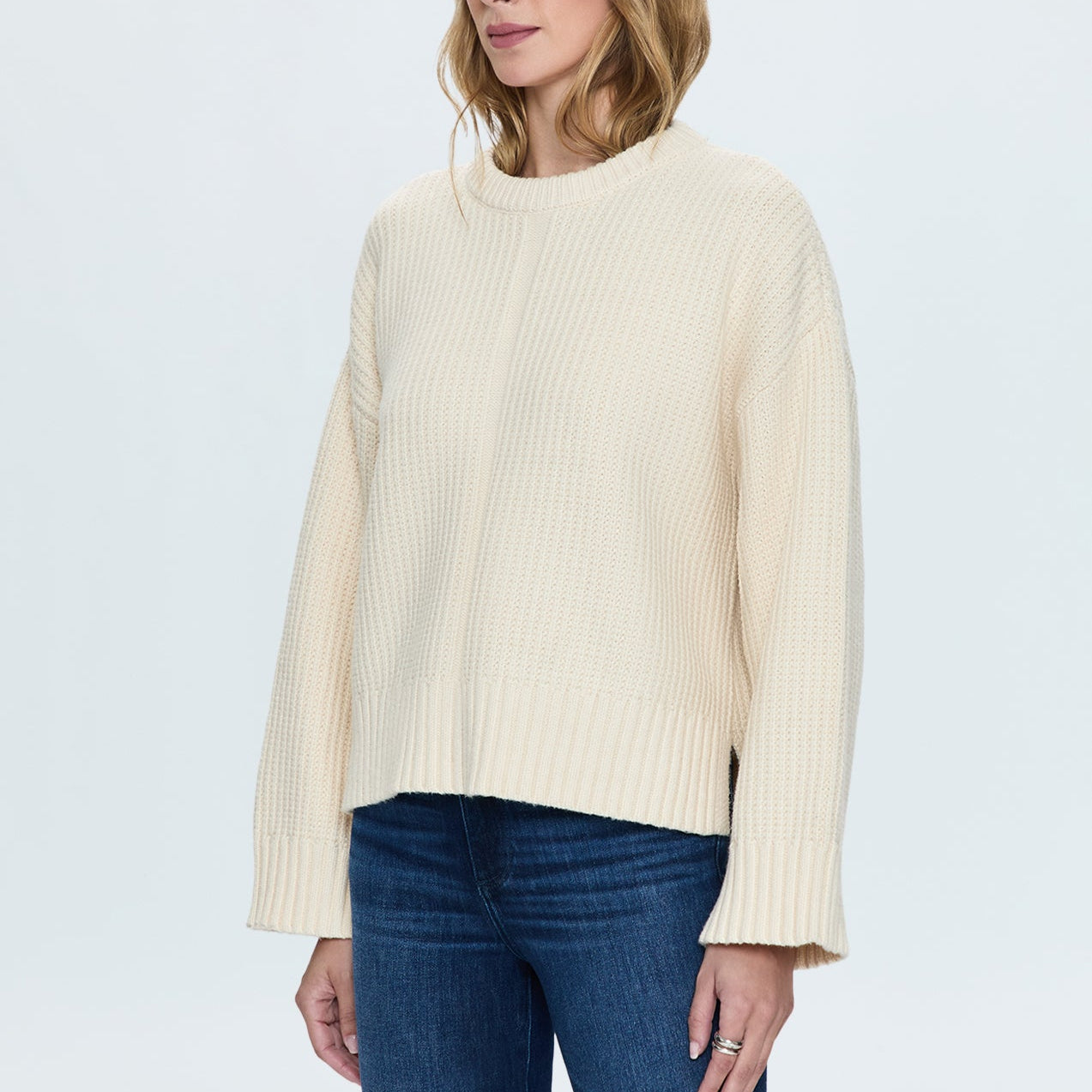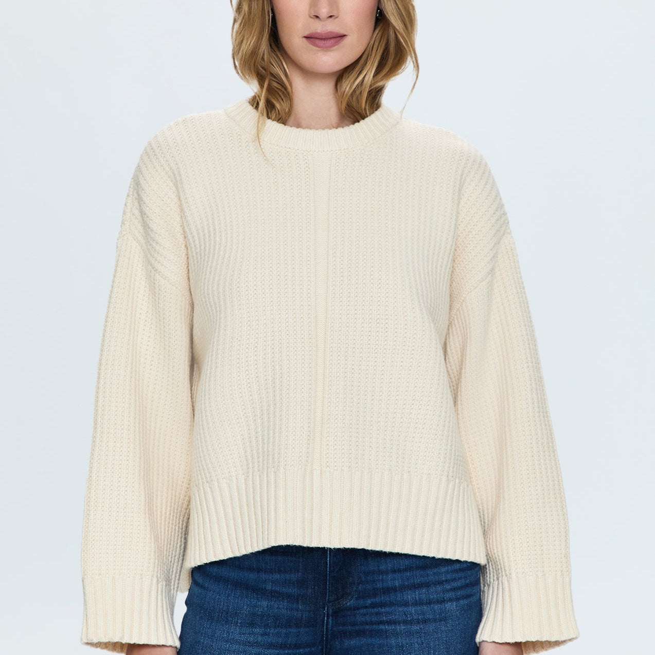 Textured sweater with variegated contrast ribbing for an elevated finish. Crew neckline with long bell sleeves and a split high-low hem. Offered in a warm, off-white ivory hue.