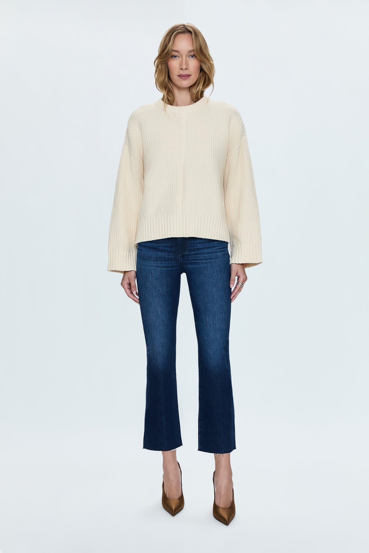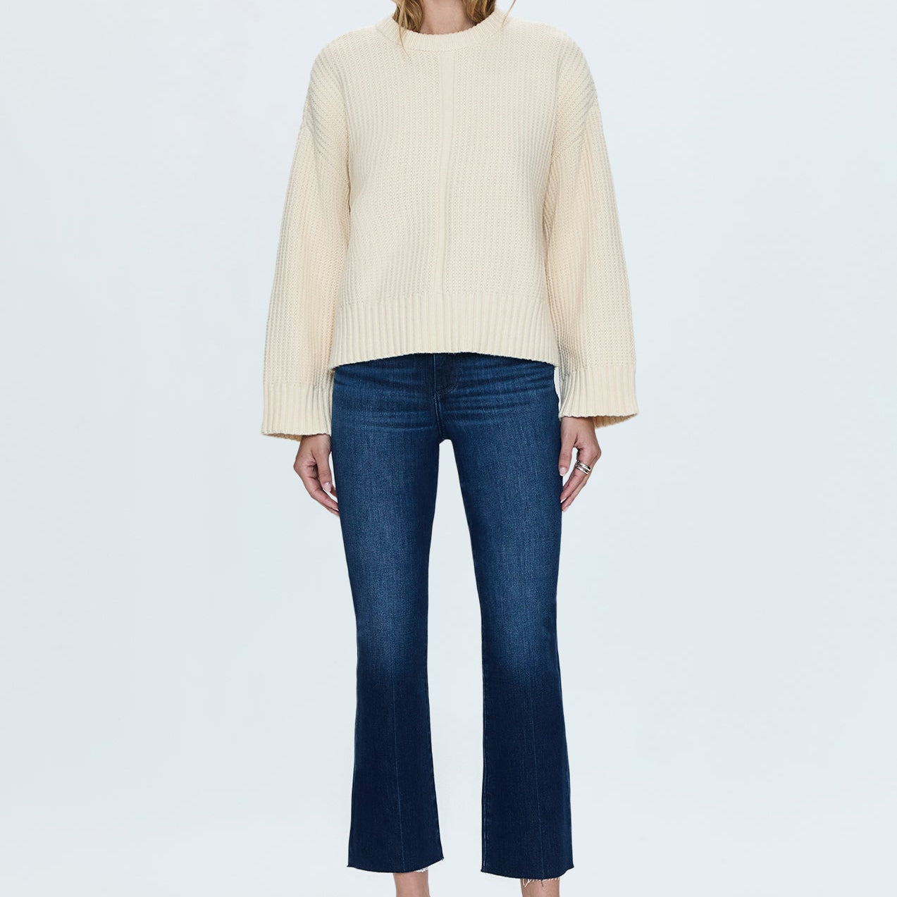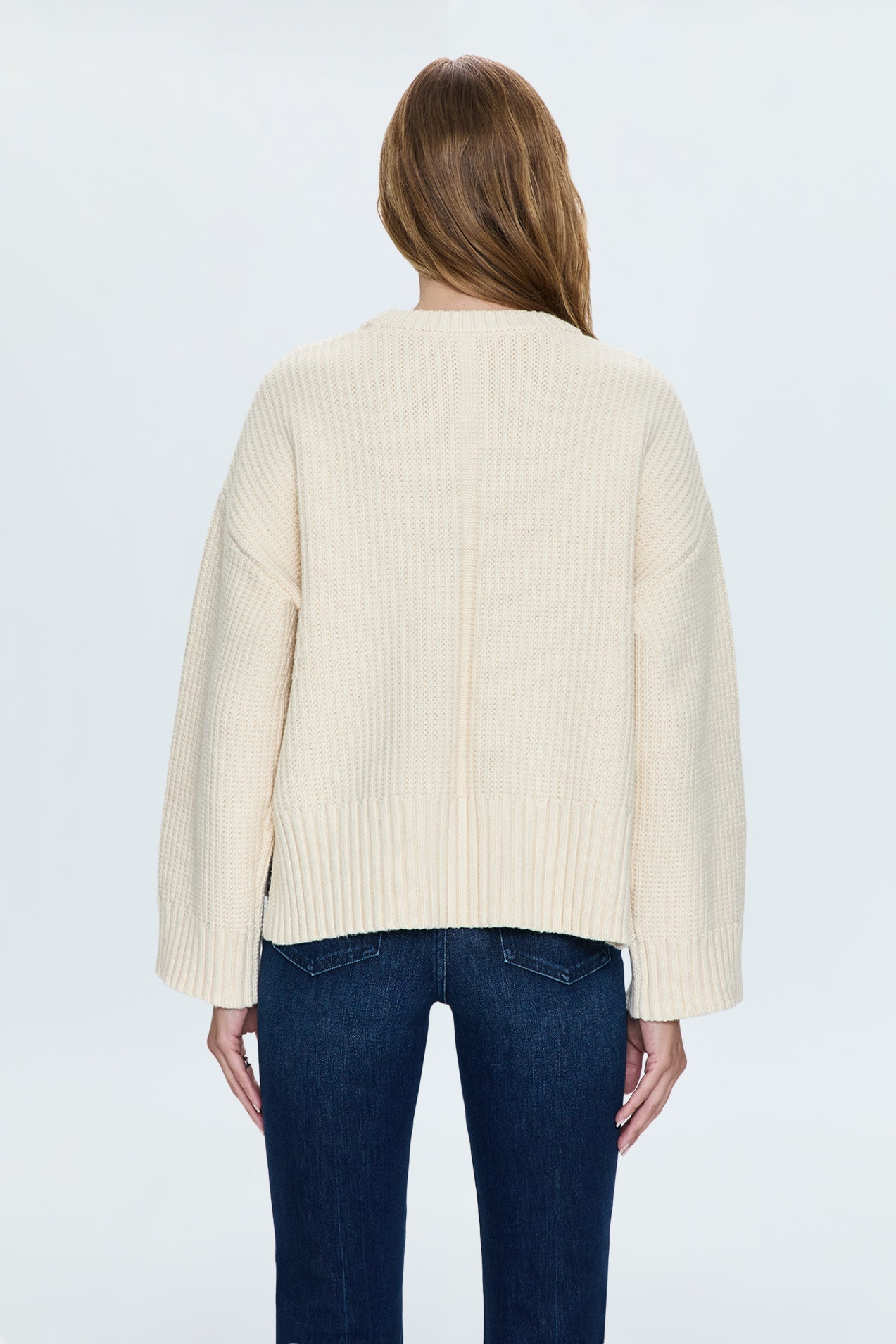 Textured sweater with variegated contrast ribbing for an elevated finish. Crew neckline with long bell sleeves and a split high-low hem. Offered in a warm, off-white ivory hue.