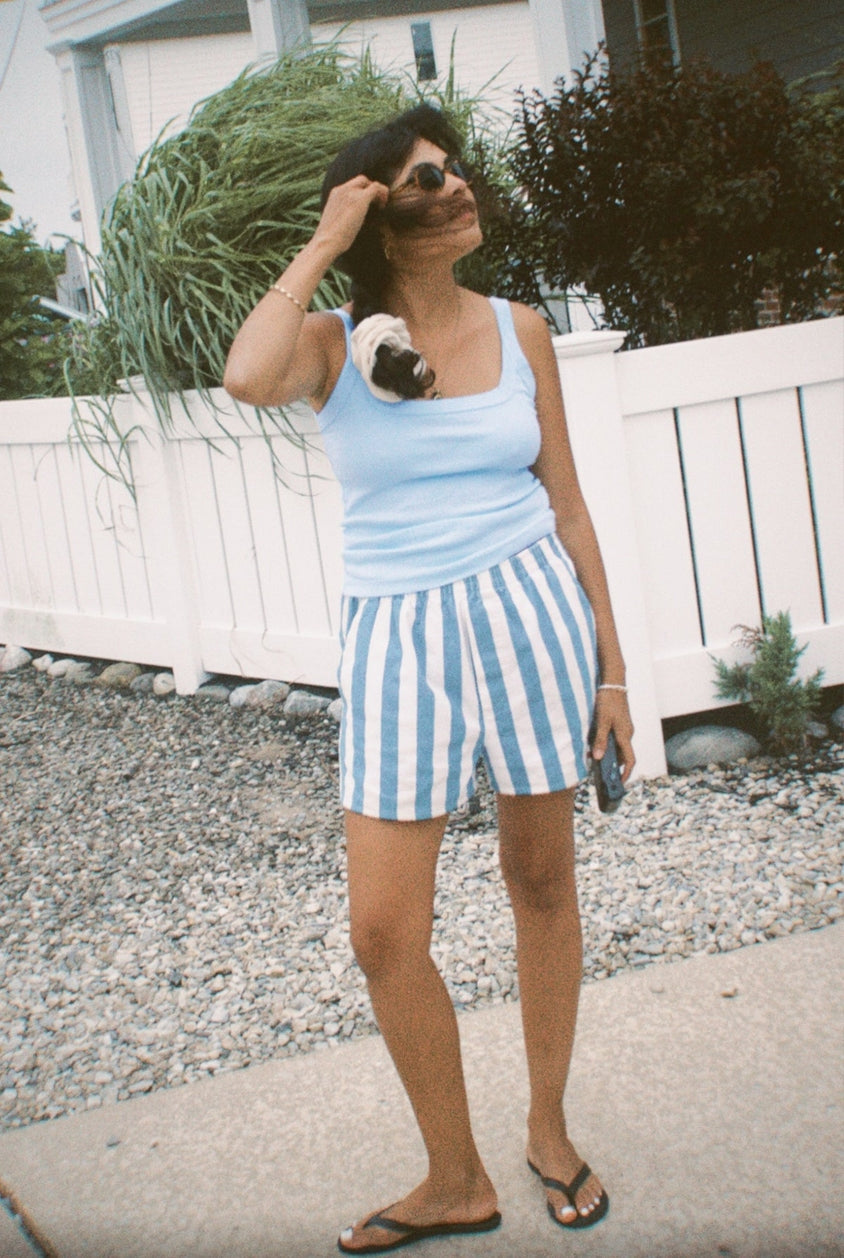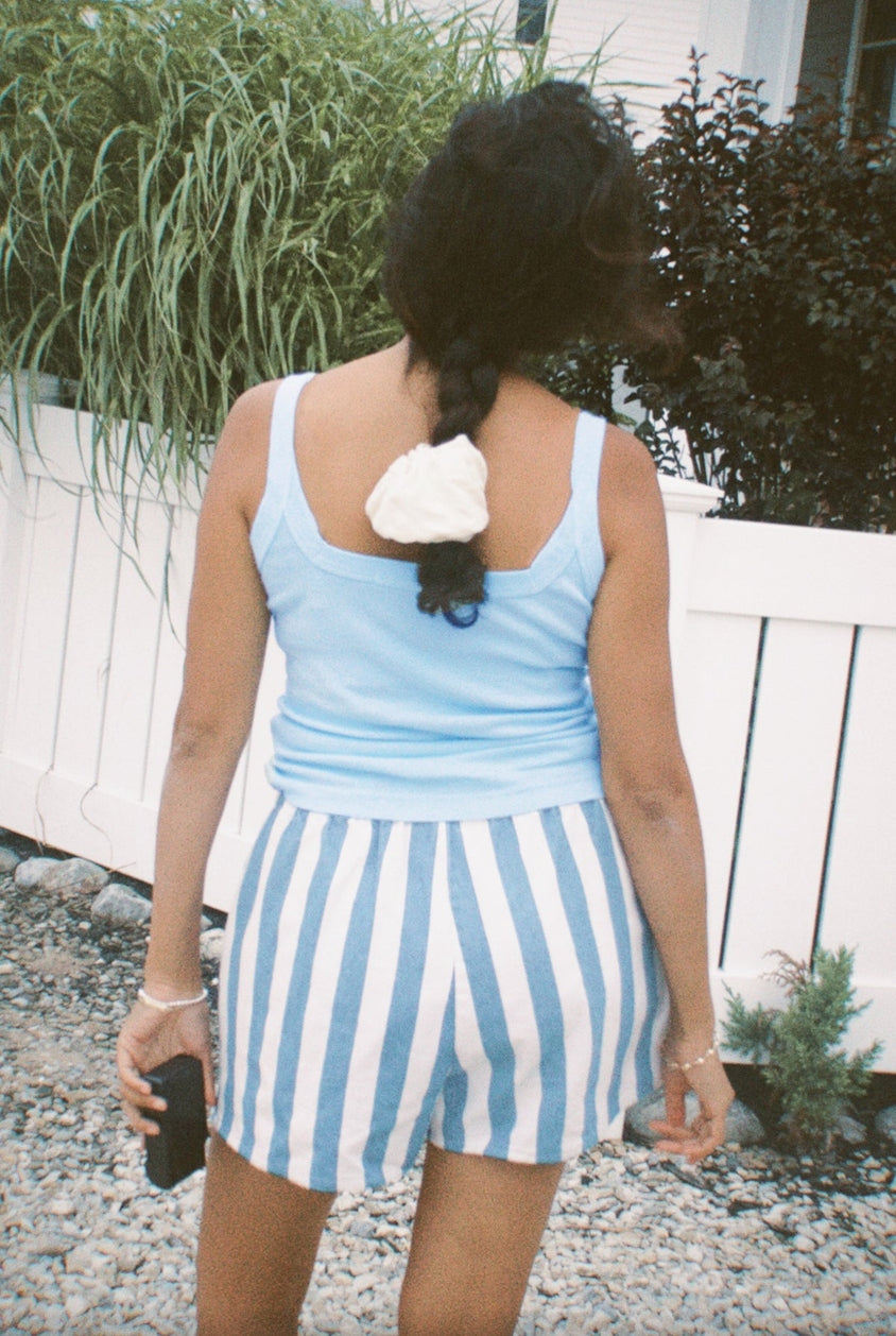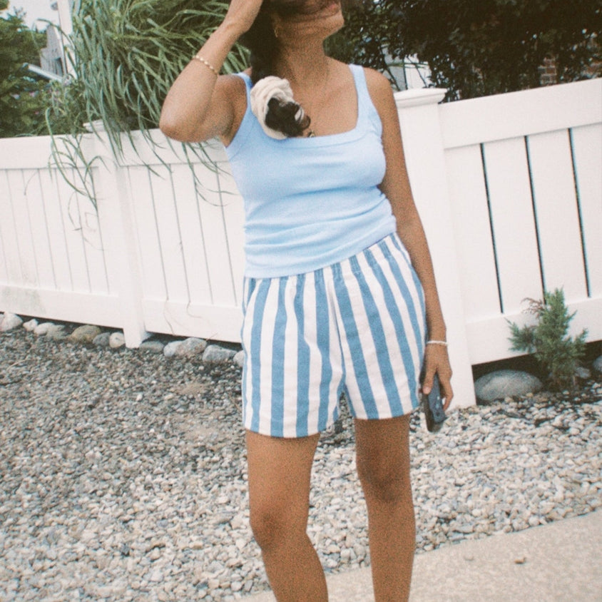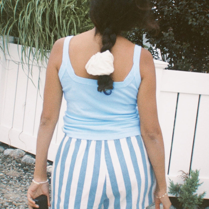 A twist on a classic rib tank, this version is cut from our breathable organic rib. Features a squared neckline and chunky straps. Organic rib knit locally in Los Angeles. Approx ~21" in length.