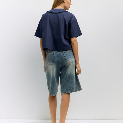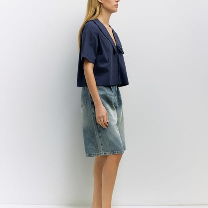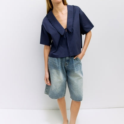 The Roseanne Top is crafted from midweight cotton poplin with a boxy fit, loose half sleeves, and a signature Marniero V-neck collar featuring lace trim and a self-tie for a delicate, effortless look.