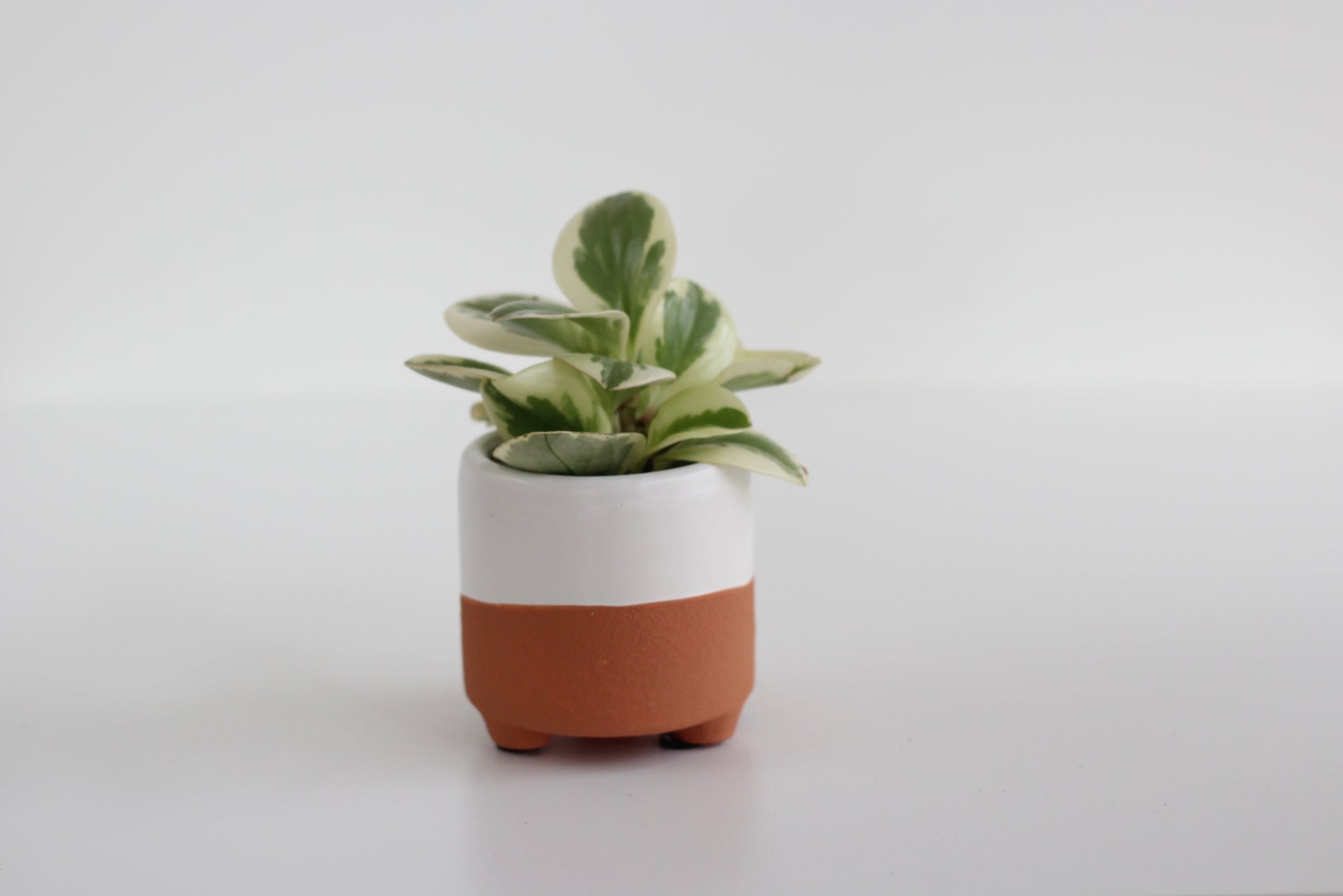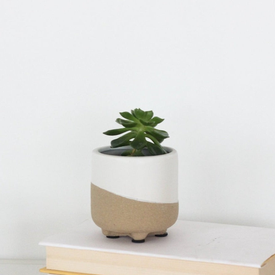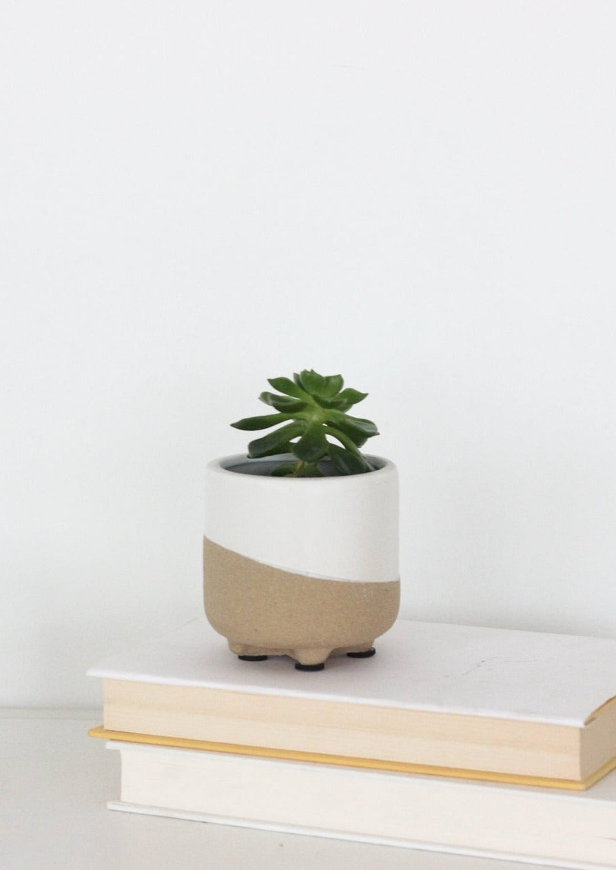 This modern planter features the best of both worlds: a smooth white ceramic as well as a natural terracotta texture, on a three-footed base.