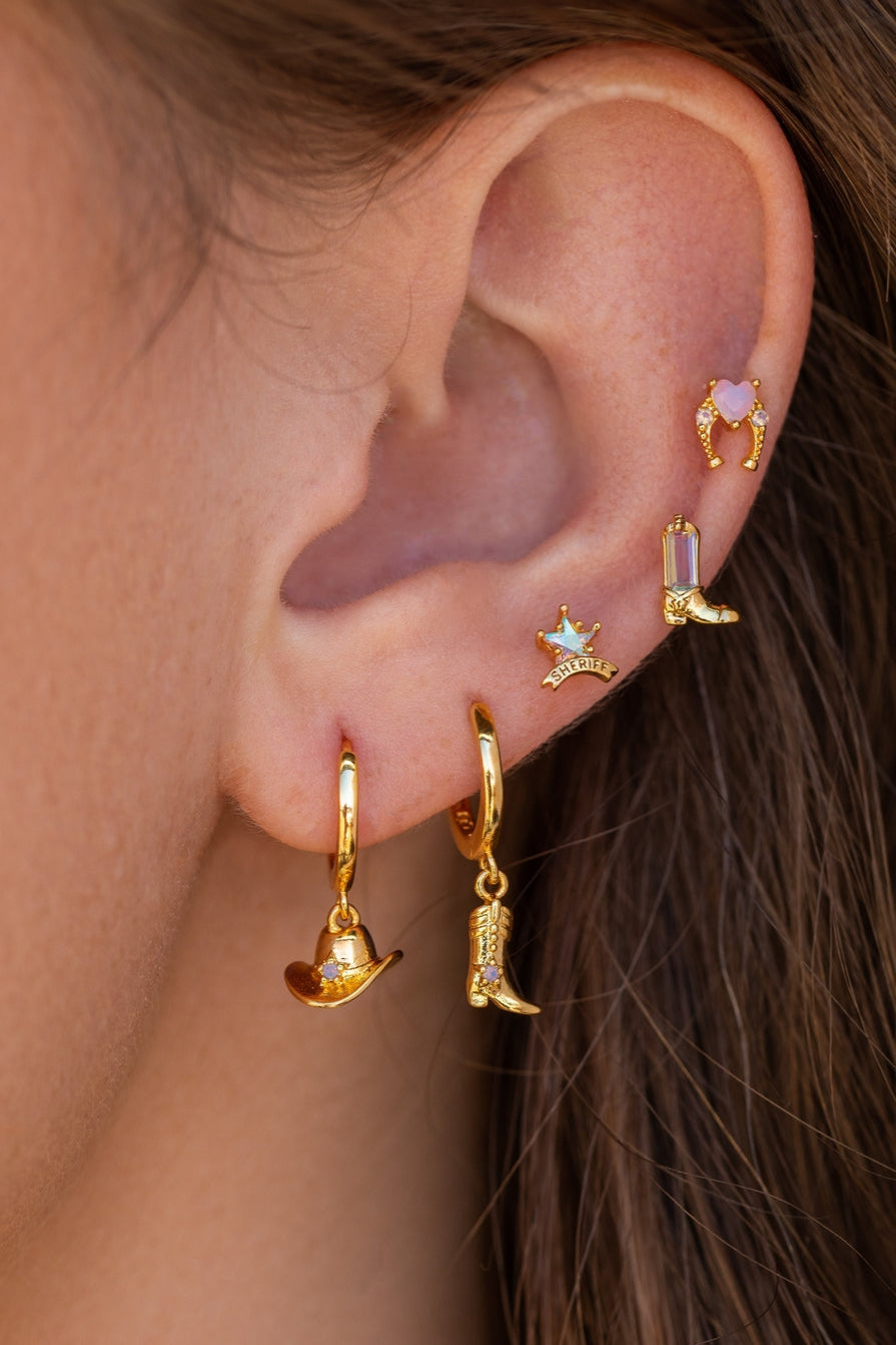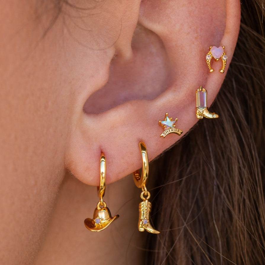 You moseyed on over here for a reason, and we've got just the thing! Our Cowgirl Stud set features iconic western symbols, including a cowboy hat, sheriff's badge, horseshoe, and cowboy boot, all adorned with an array of eye-catching stones. With this beautifully unique set, you'll be the star of your rodeo and ready to ride off into the sunset in style. So saddle up and show off those western charms!