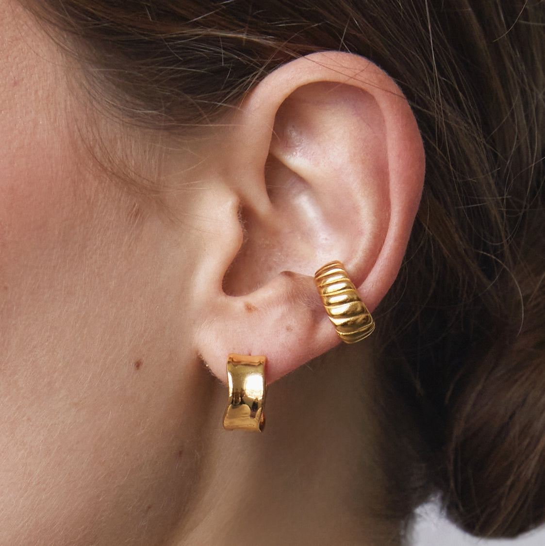 Add a touch of sparkle with these Farrah Wave Huggies Gold earrings. Crafted from 925 sterling silver and coated in radiant 18k gold plating, their 5mm width and 20mm height make them perfectly petite yet eye-catching. These playful waves hug your ears with a fun, modern vibe, adding effortless charm to any look.