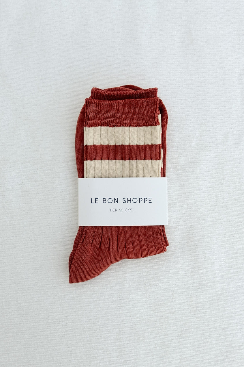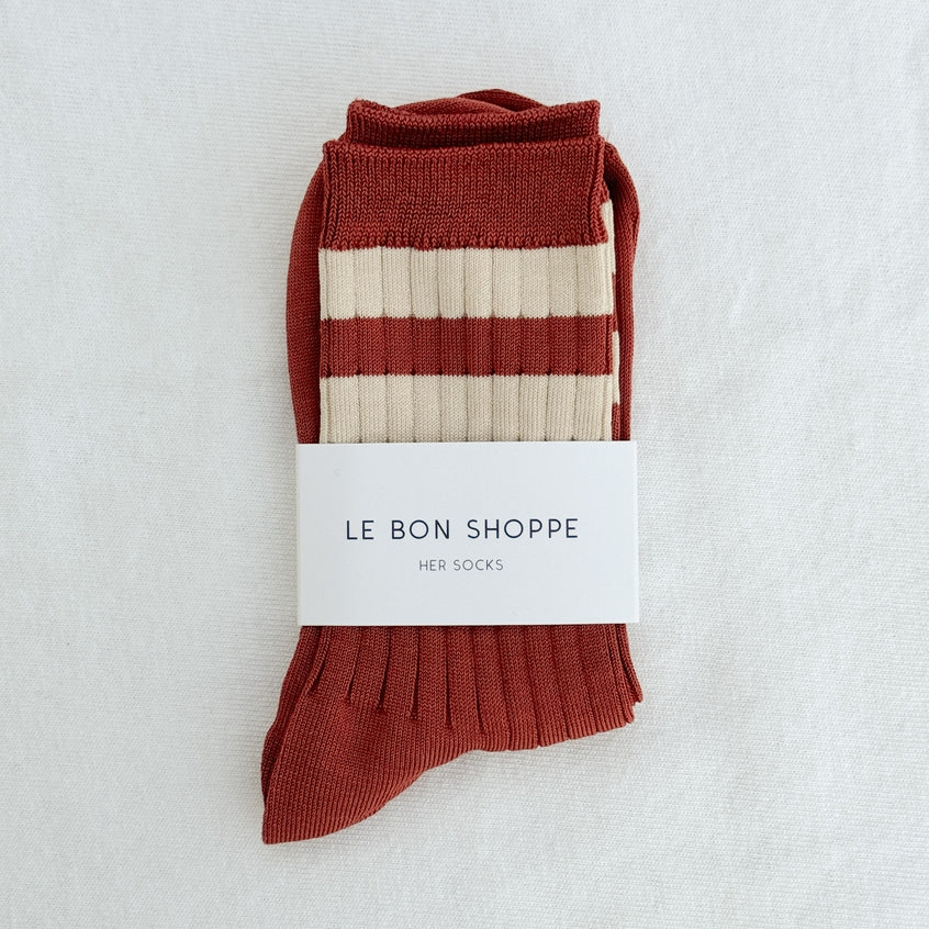 A bold varsity stripe is timeless and always a classic. Her Varsity Socks is a varsity striped version of our OG Her Socks which are classically ribbed, perfect height, cotton blend durable, chic go to socks. Add an understated sporty touch to any look with this bold stripe contrast version of Her Socks. She loves to be worn with a mini skirt, plaids, and oversized cable knit sweaters.